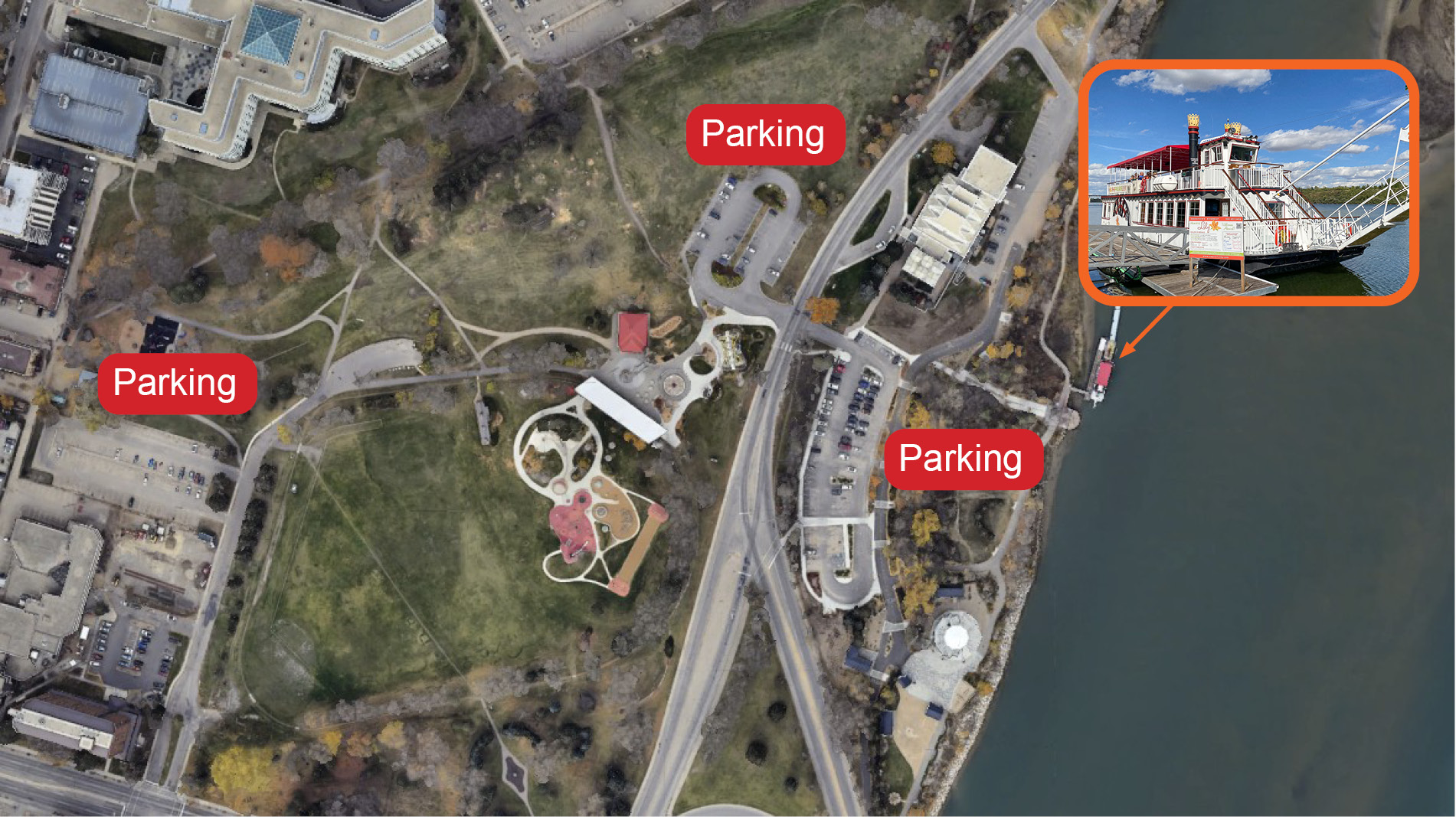 Parking is available for The Prairie Lily visitors at a number of locations in the Kinsmen Park Area.