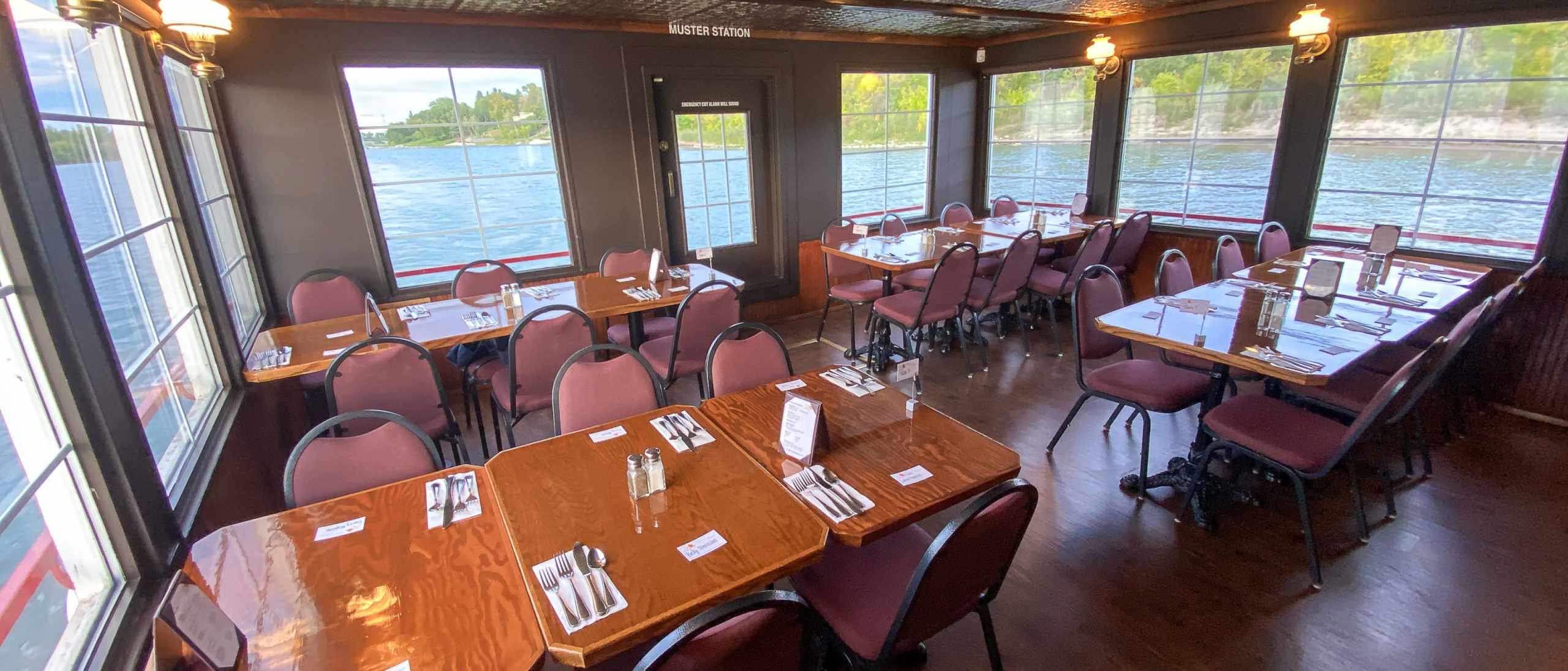 The Captain’s Lounge is the back dining cabin on the Main Deck of the Prairie Lily and seats up to 30 people. The forward Saskatoon Lounge on the Main Deck can also seat up to 30 people. Combined, 52 seated guests (mirroring our upper deck limit) are welcome to enjoy a dinner cruise. Please note, dinner is not served on the upper deck.